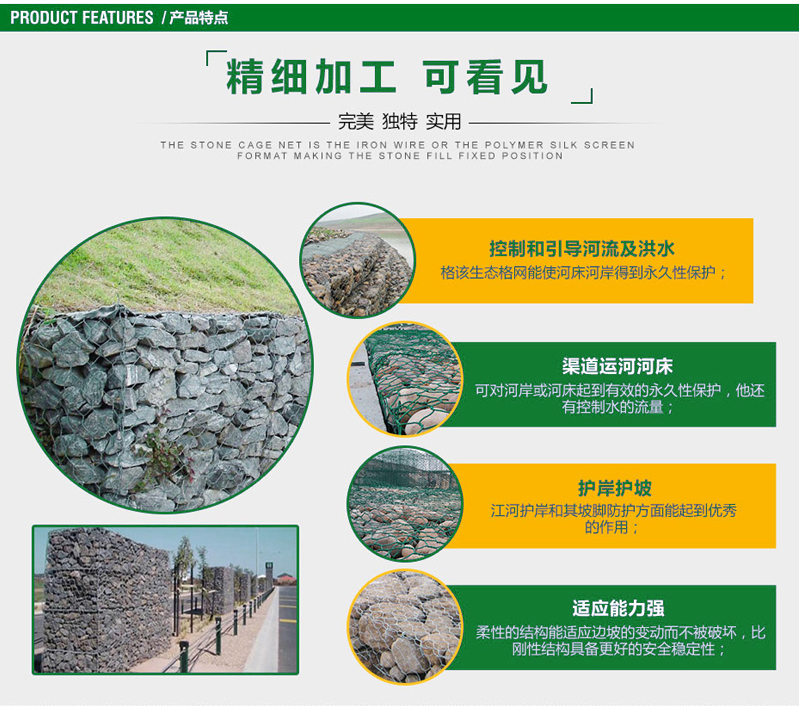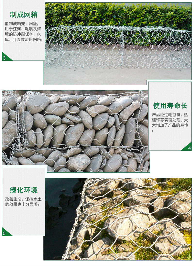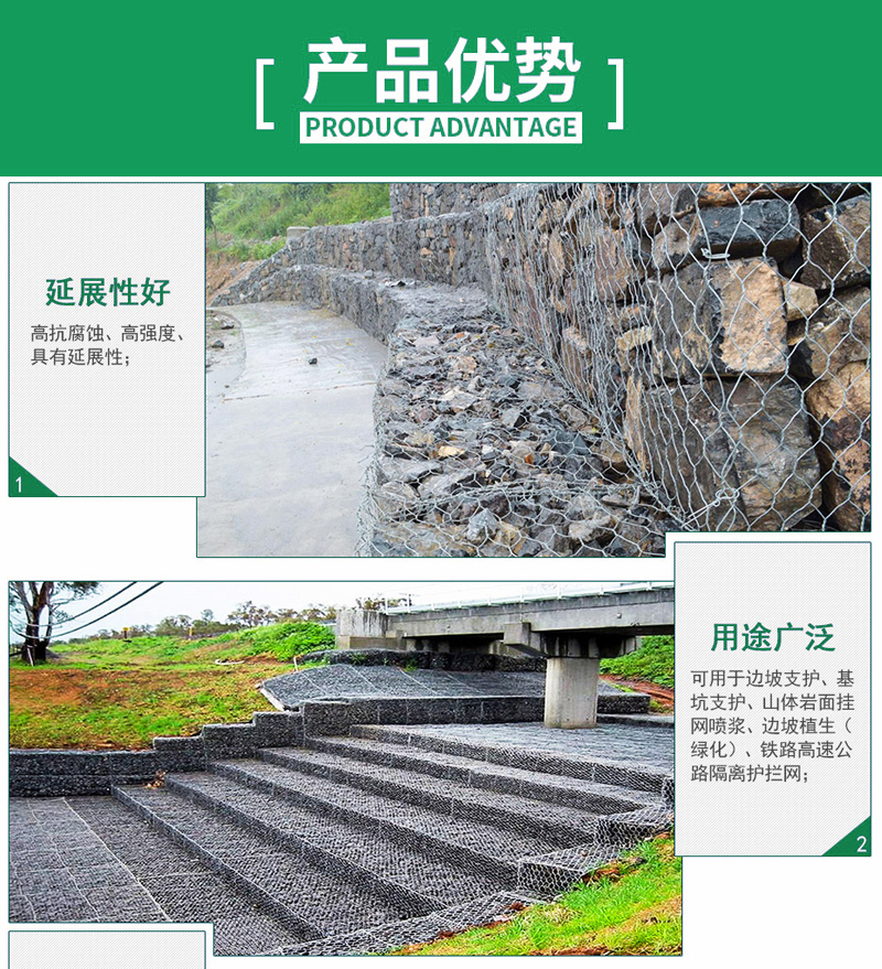 綠濱墊產(chǎn)品又名格賓網(wǎng)墊,賓格護(hù)墊,綠格網(wǎng)墊,是有熱鍍鋅低碳鋼絲雙絞合專用機(jī)器熱鍍膜編制而成,人工折邊,打包壓縮,運(yùn)輸?shù)焦こ讨付ǖ攸c(diǎn),工人即可施工,雷諾護(hù)墊具有穩(wěn)定性,透水性,柔韌性等優(yōu)點(diǎn),使用年限根據(jù)當(dāng)?shù)乜陀^條件,氣候條件,雷諾護(hù)墊材質(zhì)決定,一般高爾凡鍍5%-10%鋅鋁合金鋼絲使用年限至少50年是沒有問題,也是當(dāng)代21世紀(jì)倡導(dǎo)環(huán)保綠化的主要產(chǎn)品之一,生產(chǎn)每一批貨物符合國家行業(yè)標(biāo)準(zhǔn)EN10223-3,保證工程完美竣工。